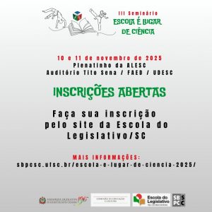 Estão abertas as inscrições para o III Seminário Escola é Lugar de Ciência, que será realizado nos dias 10 e 11 de novembro no Plenarinho da ALESC e no Auditório Tito Sena/FAED/UDESC.